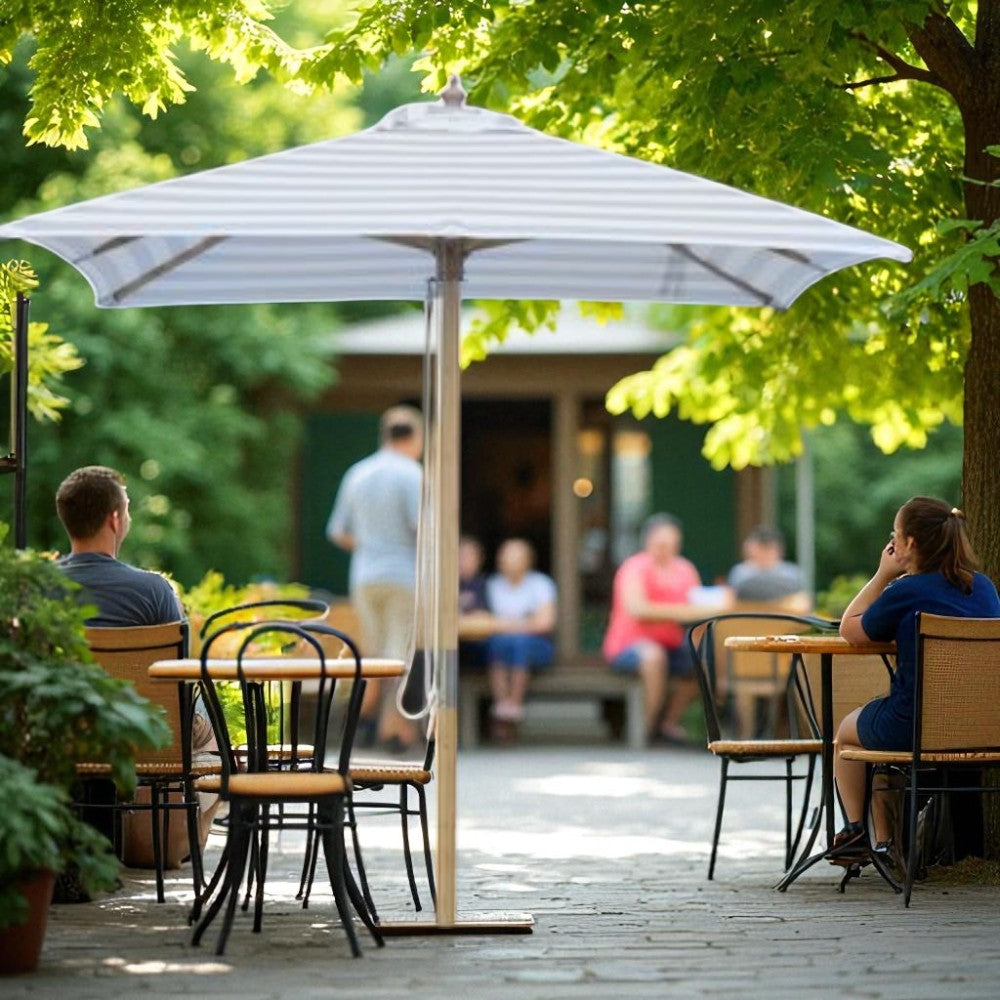 The sun sparkles while you sit under this intimate grey and white striped umbrella sipping an Aperol and tonic listening to the waves crashing into the shore. Pull out 3 comfortable chairs and a low-slung coffee table and enjoy those lazy summer afternoons.