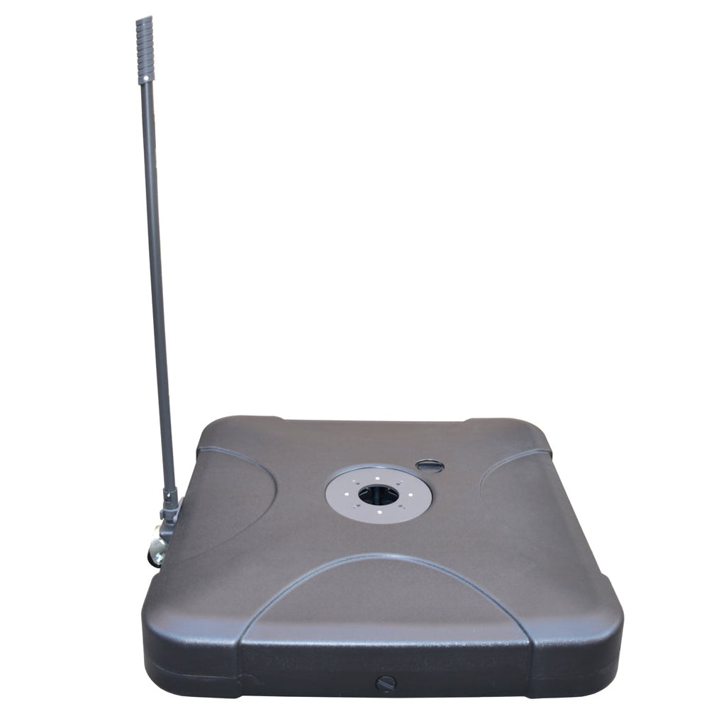 The Santa Fe is supplied with a full movable polycarbonate base. This base has retractable wheels and allows the umbrella to be moved anywhere on your deck or patio, to suit your needs at the time. When you have the umbrella in position, simply retract the wheels. Best of all, the polycarbonate base won't rust and stain your deck or pavers, unlike cheaper cross bases. Fill with either sand or water for best results.